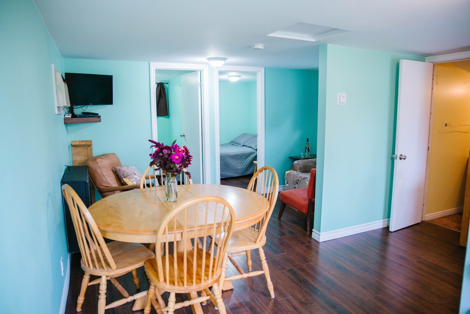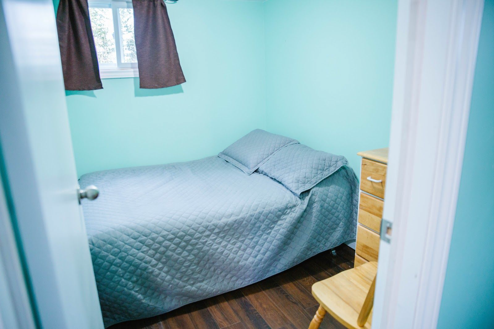 Our third cabin has 2 bedrooms, living area, eat in kitchen with a stove, fridge, microwave, dishes and cooking utensils as well as a three piece bathroom. This cabin is bright and cheery, sure to make you smile. For the Month of May The cabin fits 6 people and has 3 sets of bunk beds, one set in each of the rooms and the third set out in the living room. From June to November one set of bunk beds is taken down in a bedroom and replaced with a double bed and a couch is added to the living space. During your stay you will need to bring linens for the bathroom as well as personal toiletries. Bedding, kitchen linens and a BBQ with propane are provided for you and in the living area there is also a TV with satellite. We are an unplugged destination, there is no wifi available reliably in our rural area so relax and enjoy the countryside around you.