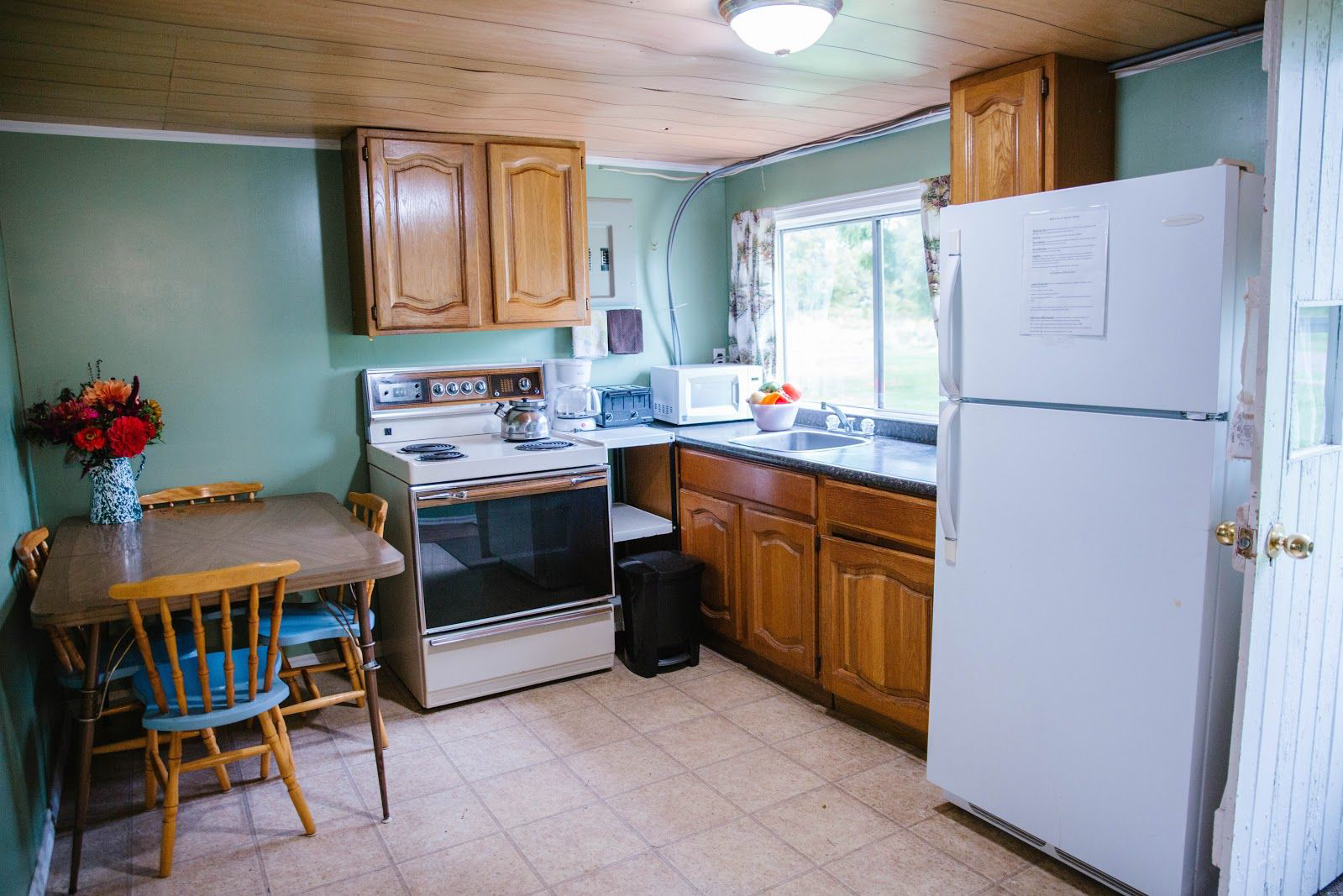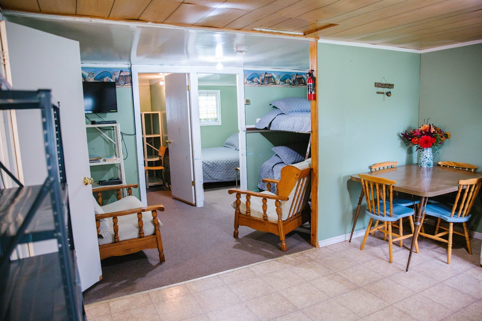 A charming 2 bedroom cabin with living area, eat in kitchen with a stove, fridge, microwave, dishes and cooking utensils as well as a three piece bathroom.This cabin has a relaxing beachy feel perfect for a vacation. For the month of May this cabin is set up to fit 6 people, two double beds and one set of bunk beds. From June until November it will fit 4 people, the bunk beds are taken down and replaced with a couch. During your stay you will need to bring linens for the bathroom as well as personal toiletries. Bedding, kitchen linens and a BBQ with propane are provided for you and in the living area there is also a TV with satellite. We are an unplugged destination, there is no wifi available reliably in our rural area so relax and enjoy the countryside around you.