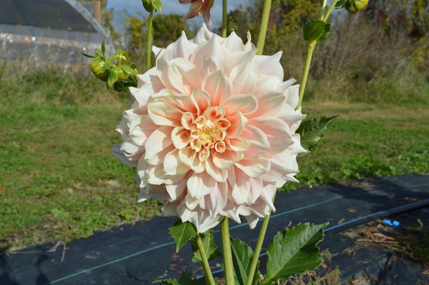 Soft blush coloured blooms with a warm cream coloured center, are perfectly suited for weddings and make a great addition to any garden. Large fluffy 8" flowers are produced on strong robust plants.